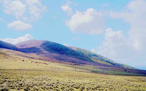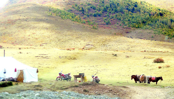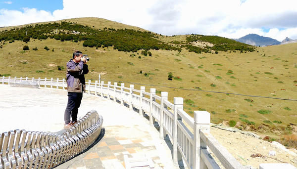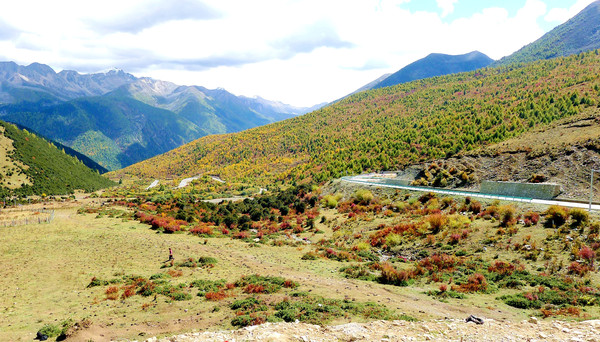 13:00离开雪山观景台,沿着国道G350继续盘山、爬高,秋色变得越发浓郁,林木也变得更加矮小、稀疏。不久后驶抵山顶,此处建有两座“康巴之眼”观景台,它们相隔仅仅百余米,都是附设宽阔停车场,还有正规的垃圾箱,不锈钢长椅,显得很规范。我们站在观景台上眺望,脚下远处是蜿蜒的公路和五彩斑斓的漫山秋色,近处则是高山草原,还有帐篷,马匹,完全就是牧区风光。