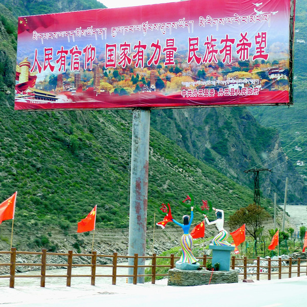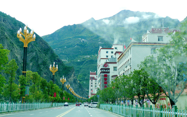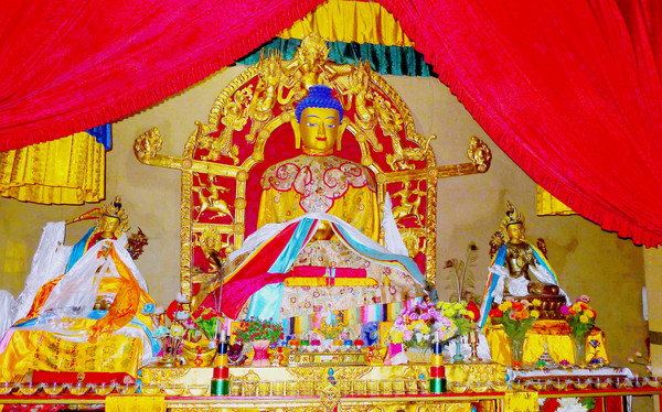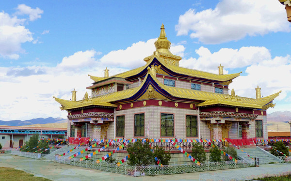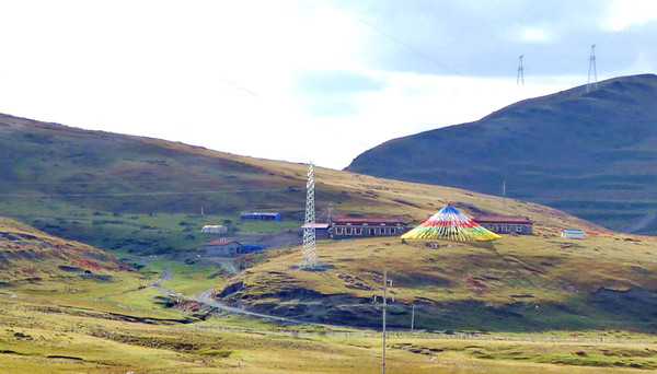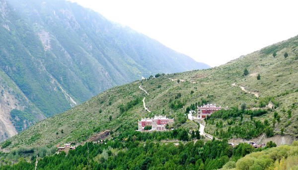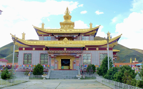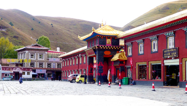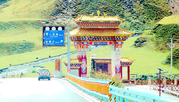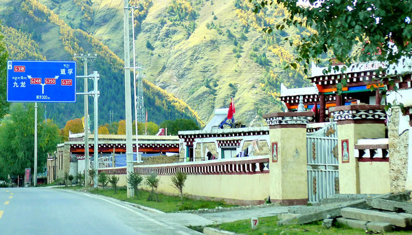 逗留数分钟后再次上路,国道路边有一座金顶的门楼,那里是通往“惠远寺”的岔道入口。“惠远寺”藏名“嘎达向巴林”,它是清政府出资为七世达赖喇嘛建造,他为躲避战祸曾经驻锡于此,后来,十一世达赖喇嘛又在这里出生,因而,“惠远寺”也就成为藏传佛教格鲁派的一座著名寺庙,声誉不但遍及康巴,而且还远扬于西藏。