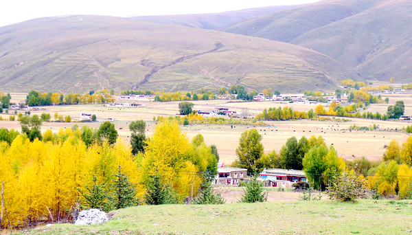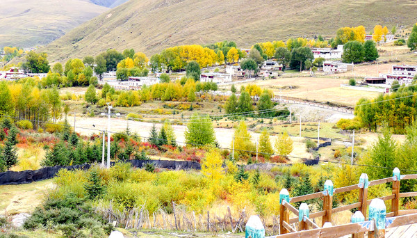 继续前行,距离新都桥也越来越近,国道两侧开始出现高大的杨树,这是新都桥之特色,金秋时节,树叶已经开始变黄。17:23抵达一处在地图上称作“多哥弄巴”的地方,这里是新都桥著名观景点之一,路边设置观景台,主要是田园风光。新都桥被称“摄影家的天堂”,其所指主要就是秋天的黄叶以及淳朴的田园,此二特点都在这里得到了展示。