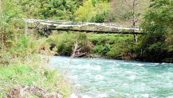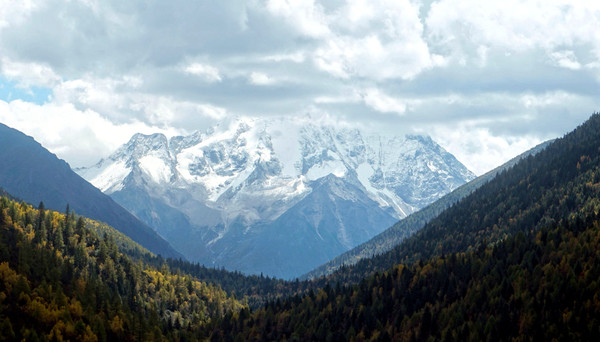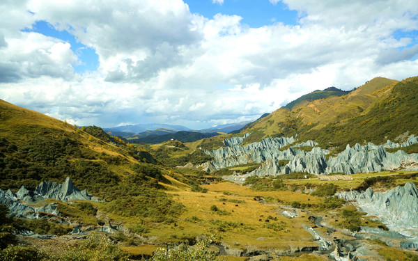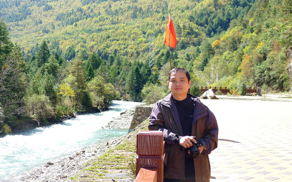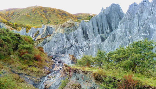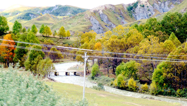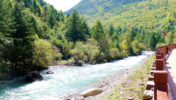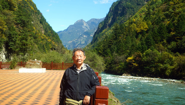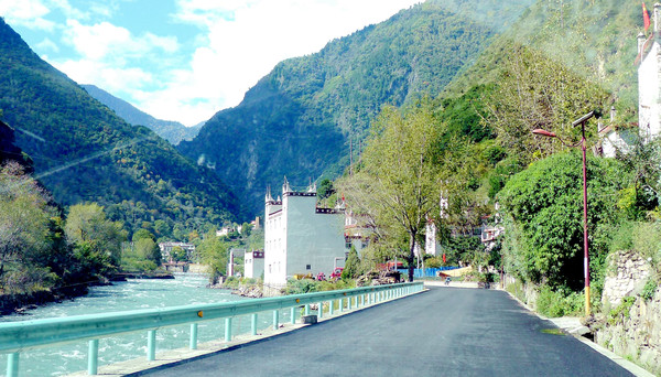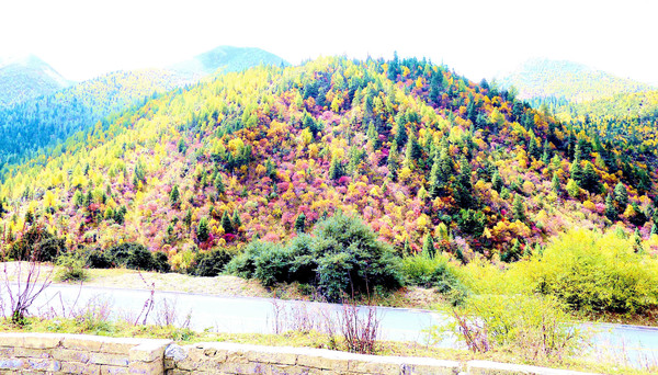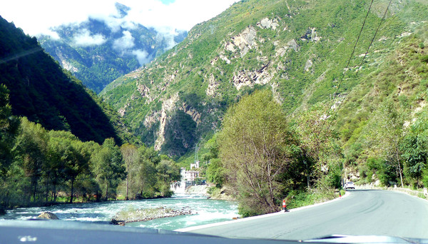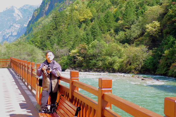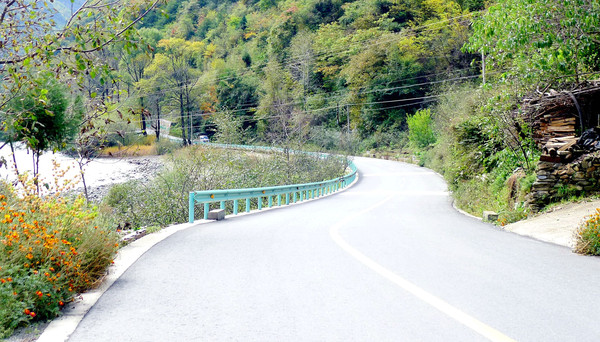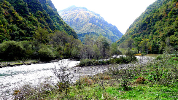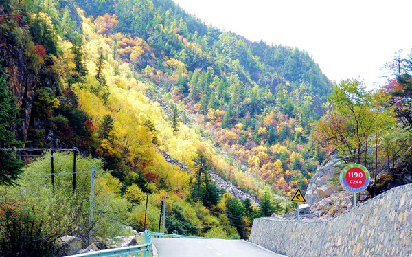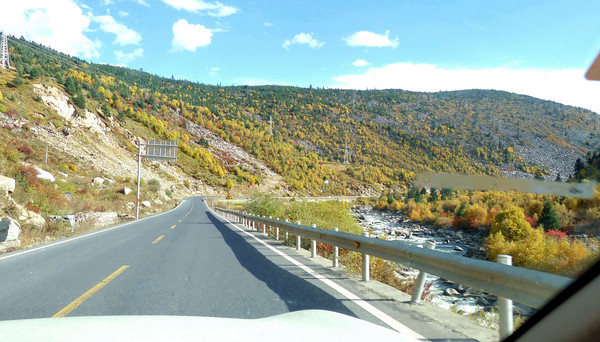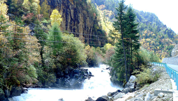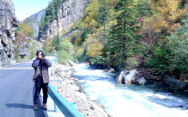 11:31驶经东谷乡的“牦牛谷”景区,我们已离开丹巴县城20公里。“牦牛谷”是一条长约10公里的山谷,山间植被茂密,谷内有条“牦牛河”流淌,水源来自雪山,水质晶莹、清澈。1985年胡耀邦视察丹巴途经此处,眼见奇峰异石草木葱茏,赞叹好似“天然盆景”,因而,“牦牛谷”也就有了“东谷天然盆景”之称。我们沿“中国熊猫大道”驱车纵贯这条山谷,多次停车拍照。可能是因为这里的海拔不算太高(2000多米),而且又是一道山谷,虽然时节已入金秋,但山间的秋色整体上并不浓郁,林木也才刚刚开始换装,放眼所见仍为一片翠绿,仅有少量的黄、橙、红色参杂。