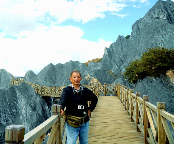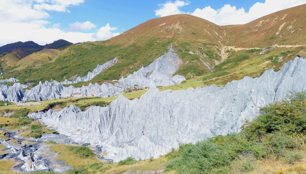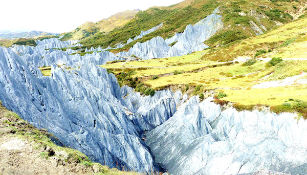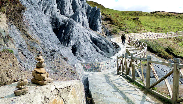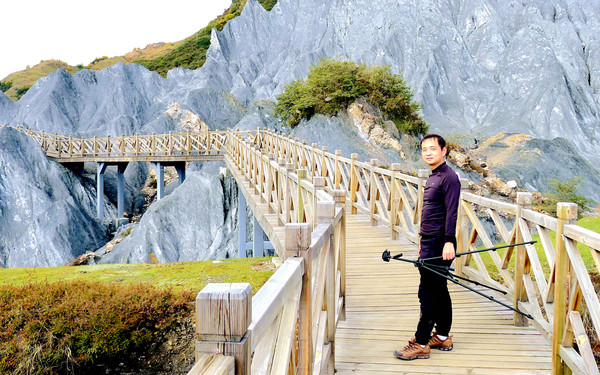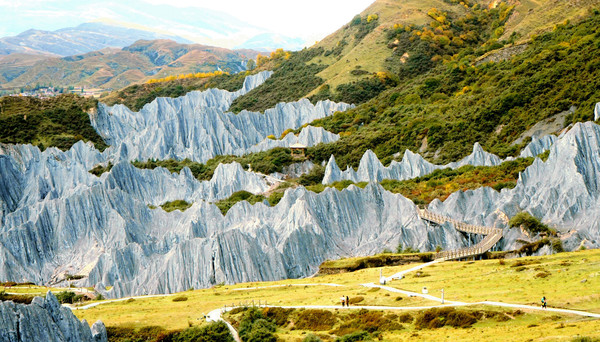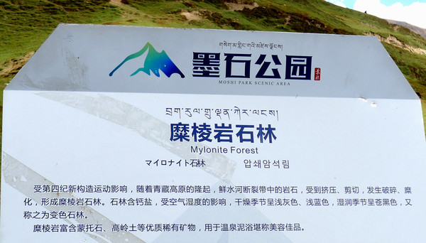 “墨石公园”面积约5平方公里,海拔3500米,我们沿着栈道前行,主要是走平路,尽量不爬山,沿着江山亭→墨石神泉→万剑穿空→石林五卫士→草地→地质博物馆的线路,15:41走到景区出口,再搭景区观光车,15:45重返景区售票处停车场,总计逗留1小时15分钟。据说,墨石公园的绚丽景色是与当地丰富的糜棱岩有关,这种岩石柔弱又含钙质,易于受到风化和流水侵蚀,我们所见千姿百态的石林也正是大自然的鬼斧神工所为。而且,糜棱岩的含水量极易受到环境影响,含水量的改变又会致使糜棱岩的颜色生变,干燥季节呈浅灰色、浅蓝色,湿润季节呈现黑色,故称“墨石”,因此,与其他地方的石林相比,八美石林又有易于变色之特点。
