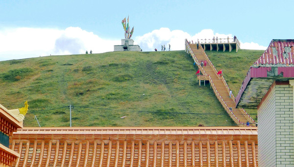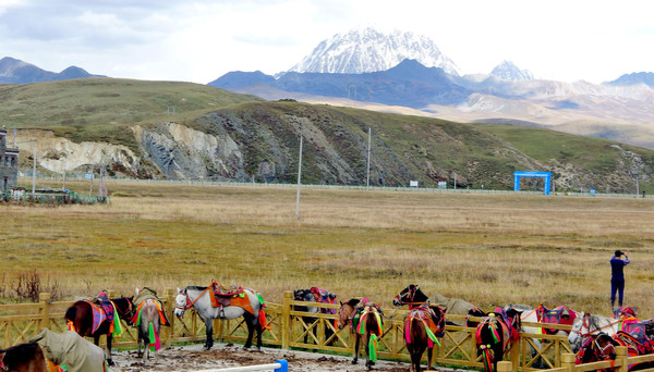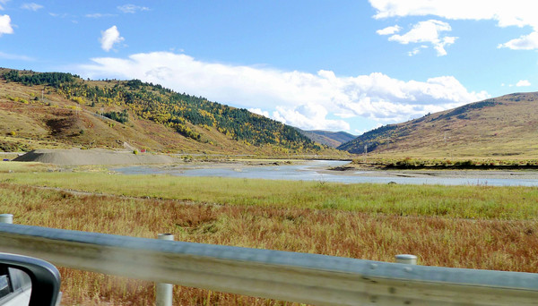 “塔公草原”景区与木雅金塔是近邻,两家共用一处停车场,草原景区内部有木栈道通向一座小山,山顶建有观景亭,除此以外就再无任何旅游设施,唯有付费骑马等旅游服务项目。我们在墨石公园就曾闻听一位成都游客告诫,来到塔公草原根本就不必购票进入景区,景区里面是草原,外面也是草原,根本就没任何差异。X.J.也说,我们从八美过来这一路所见都是草原,这个草原景区就不必再看了,前方还有新都桥杨树林的秋色,去晚了没有阳光,景色就会大打折扣。于是,16:31我们驱车离开金塔,继续赶路。