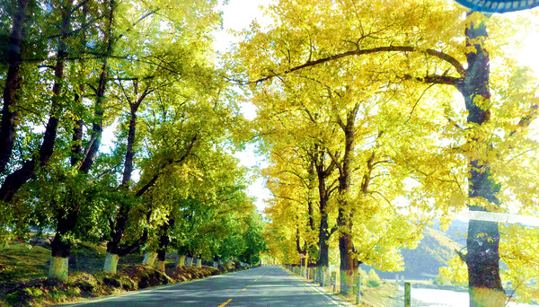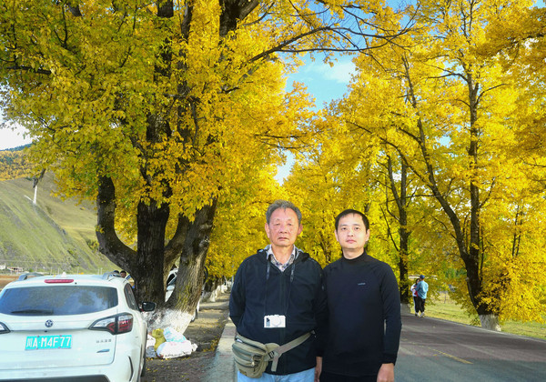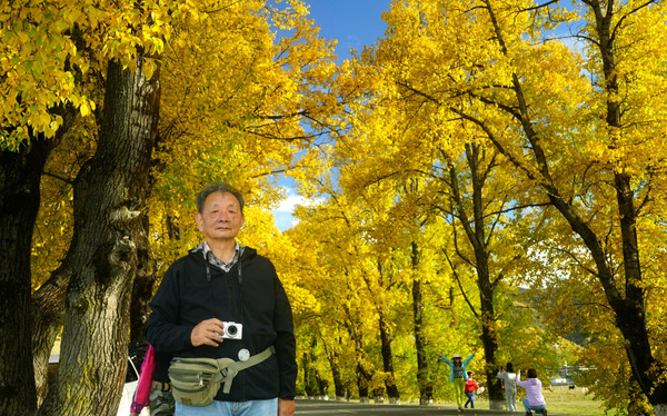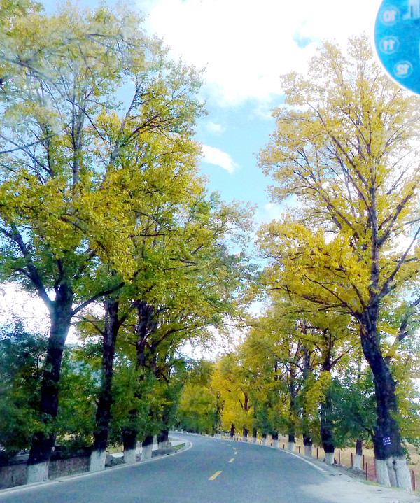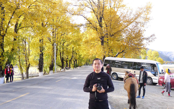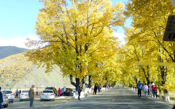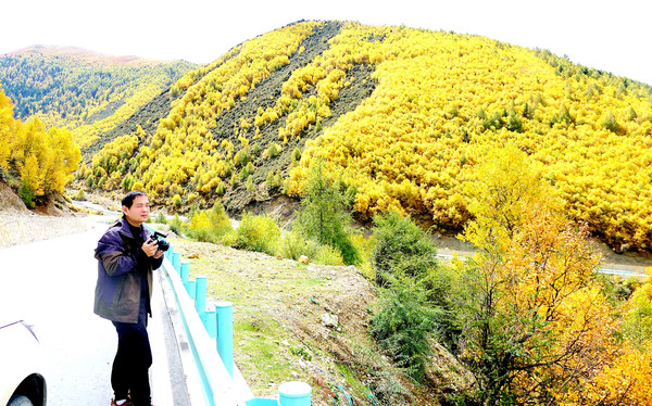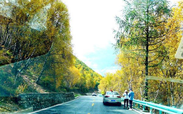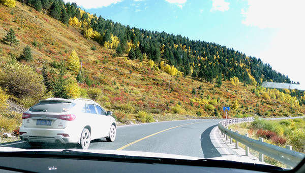 再向前行,17:28遇到黄叶最美的路段,这才是真正的“摄影家天堂”,游人纷纷停车、拍照。也有不少人涌上公路,肆无忌惮地占据路面摆拍,这其实是很危险,新都桥有句格言:新都桥是摄影家天堂,但也要切忌成为拍摄者的“天堂”。我们还是小心谨慎,只敢站在路边留影。
