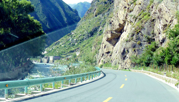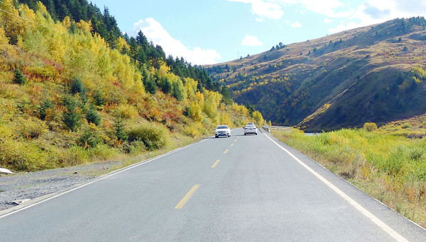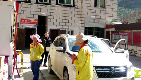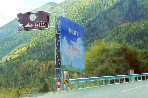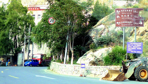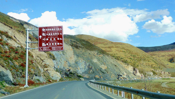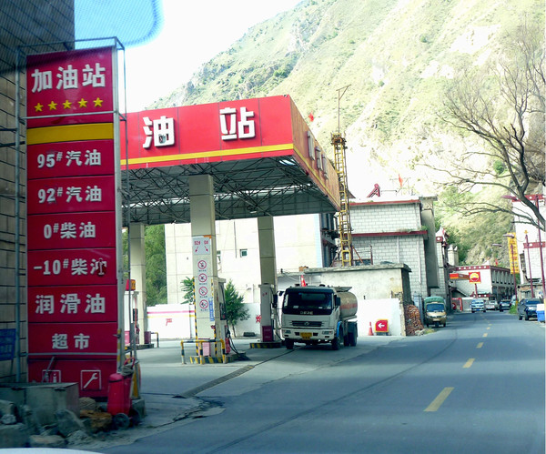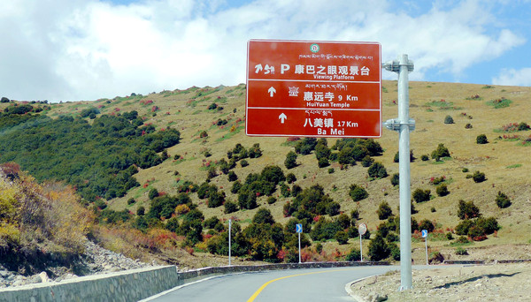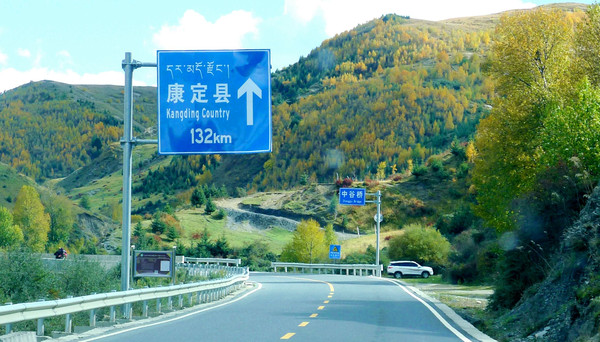 买好氧气,再走“嘉绒大桥”重返“革什扎河”北岸,这里是从丹巴前往道孚的公路起点,从此处往前58公里是“牦牛谷风景区”,70公里是“雅拉雪山”。见到路旁有加油站,11:06停车加油,因为是藏区,加油必须出示身份证。加好油再走国道G350,目标是八美、新都桥,从这里开始,一直到“八美”,百度导航就总是强调“中国熊猫大道”,公路用“熊猫”冠名,足见其沿途风光秀丽。事后所见也确实如此,在这条公路的沿线,凡风景好的地方都会设置路边观景台,凸显公路的旅游功能。我2007年从丹巴赴新都桥,也曾走过这条线路,当年的感觉是景色虽佳,但路况很差,而且非常狭窄。现时则是全程平坦柏油路,路况也明显优于昨日从马尔康到小金所经历的省道S210。