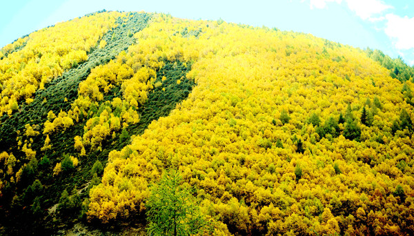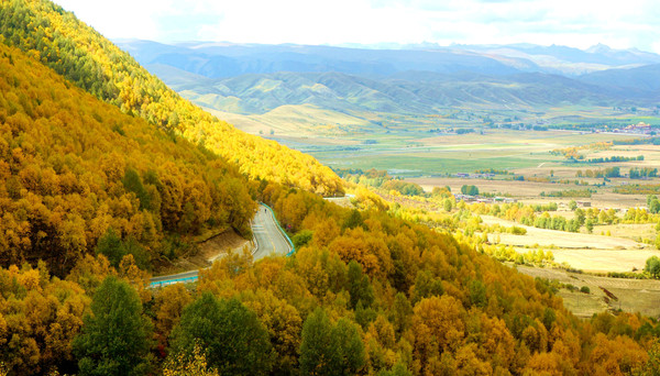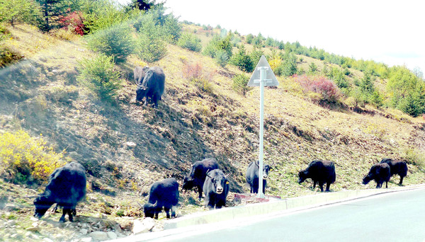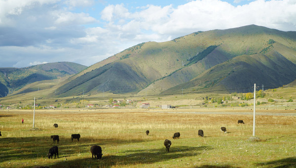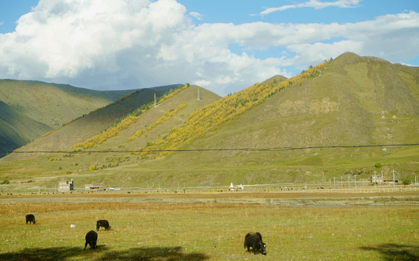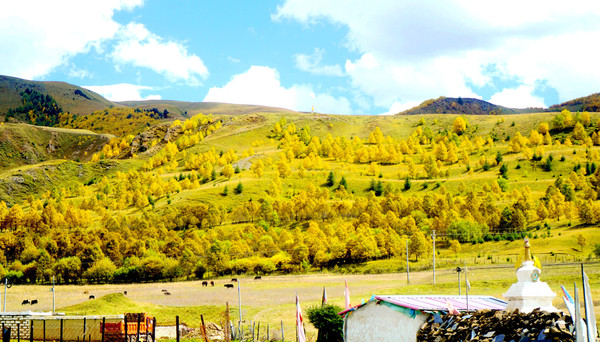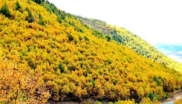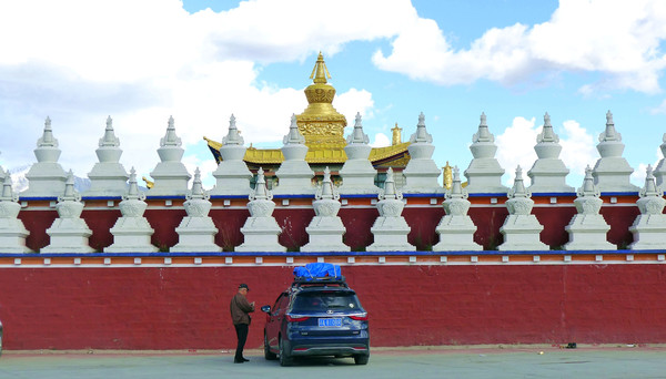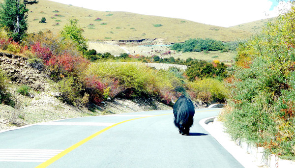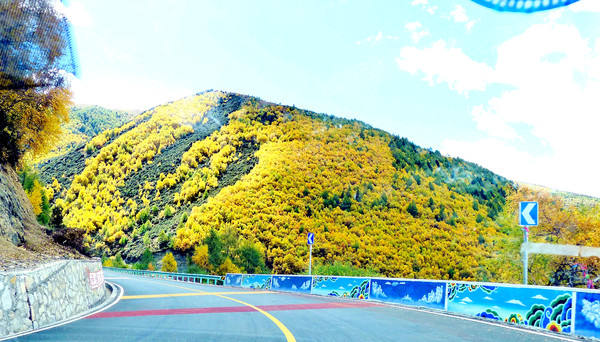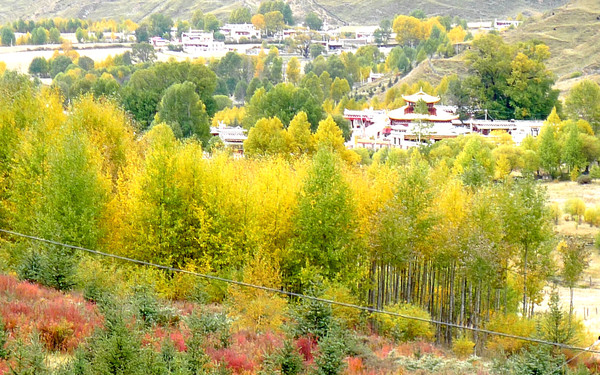 过了“疙瘩梁子”就是持续下坡,路边树木又开始增多,公路上也出现了散乱野放的牦牛,它们都是自由自在地行走,没有主人跟随。13:19绕过一座小山包,眼前突现的壮丽景象让我们即刻就感受到了无与伦比的震撼,相比于山梁东侧之五彩斑斓,西侧这边是整座大山一片金黄,“金秋”之含义也就一目了然。路遇如此壮观的秋色,X.J.立即打开双闪,将车停在路边,手捧相机不停的拍照。我站在高处眺望远方,前面有一小块平原,四周群山环绕,视野中有座寺庙,鎏金的屋顶在阳光下闪闪发光,田野、农舍被团团、簇簇的金黄、翠绿环绕,藏区的田园风光,景色也是极佳。