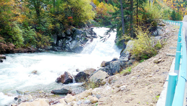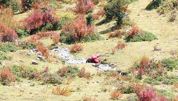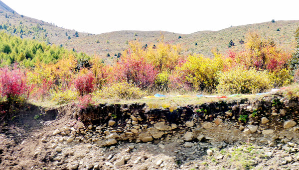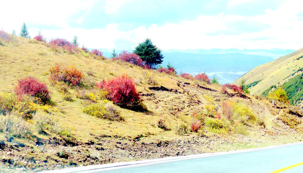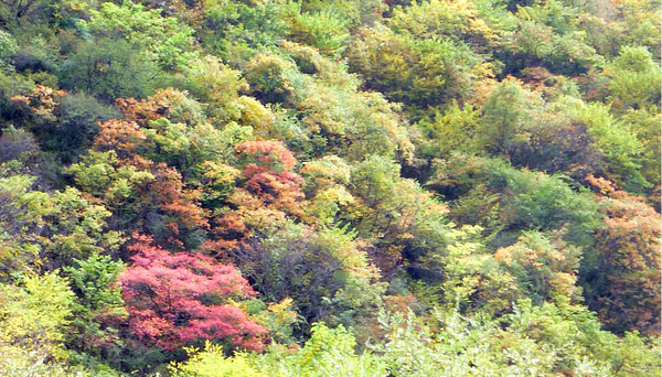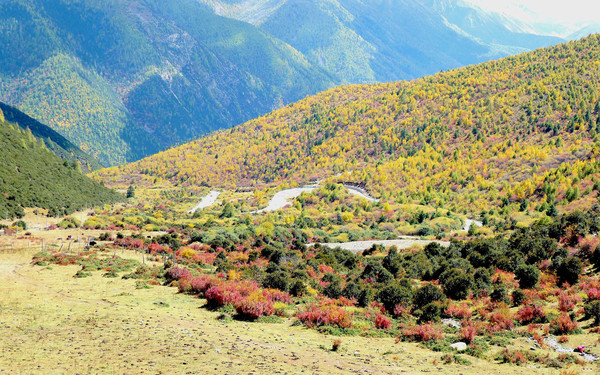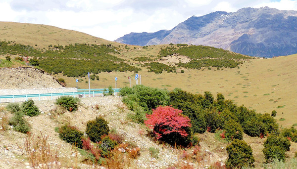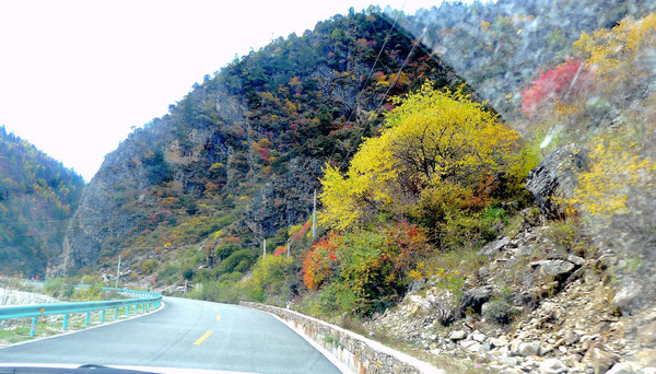 相比刚才的“盆景”峡谷,这里的海拔要高出1000多米,景观也因而产生了明显的差异,高大乔木减少,矮小灌木增多,秋天的脚步也走得更快,黄、橙、红色也变得更加醒目。