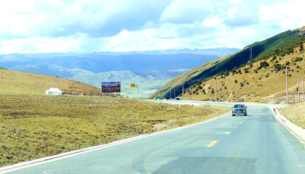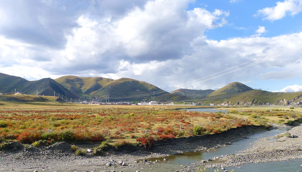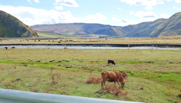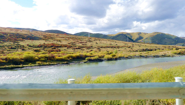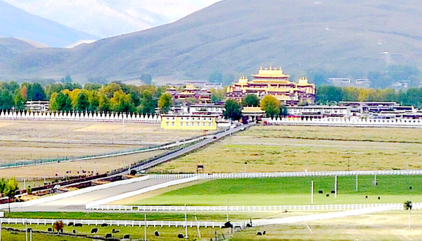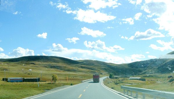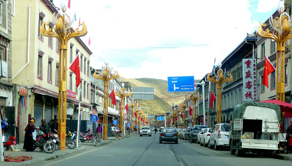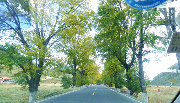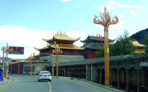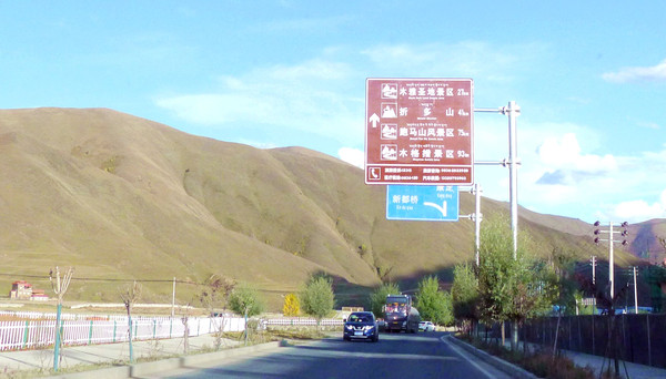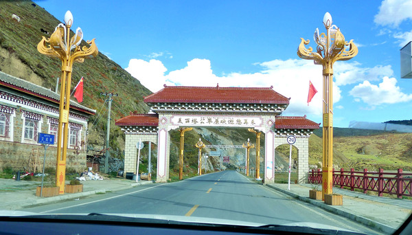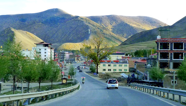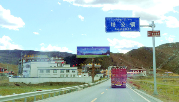 16:44驶经红墙金顶的塔公寺,它在川西也算是一座名寺,但X.J.对寺院没兴趣,我们没有停车。然后就是穿越塔公镇的街区,16:47驶出“美丽塔公草原欢迎您再来”大门,就算是告别了塔公镇。