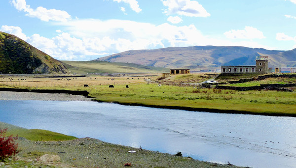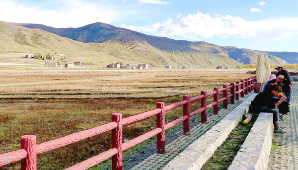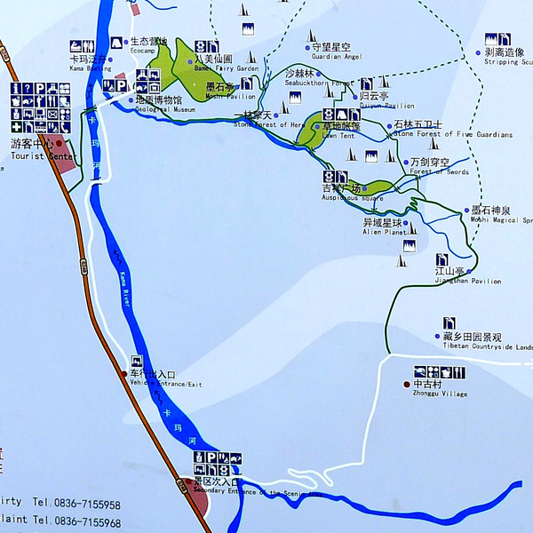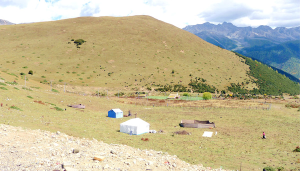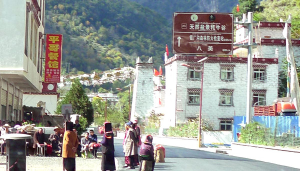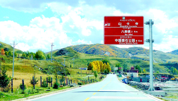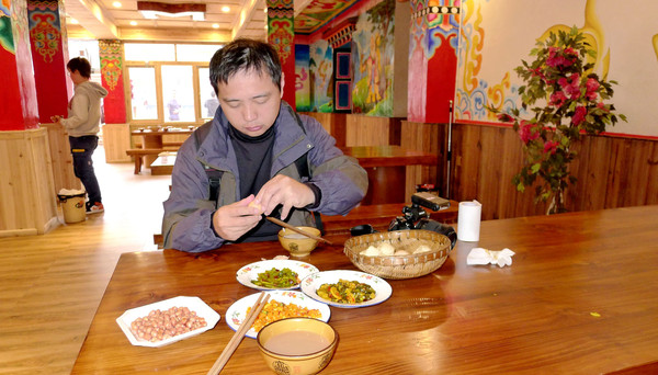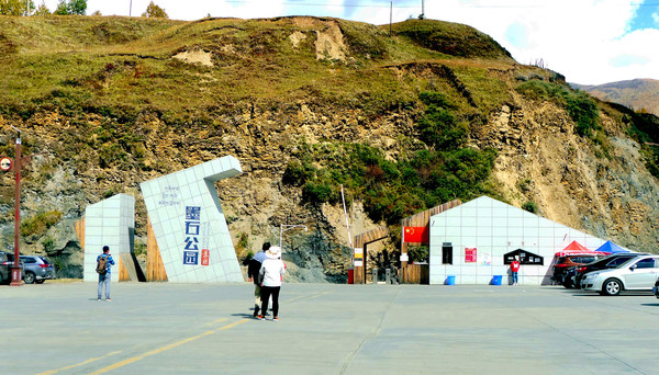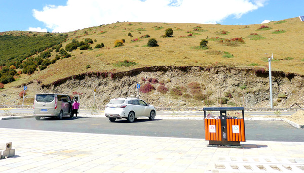 继续前行,一路的小桥流水,13:52驶抵道孚县八美镇外的“八美山庄”三岔路口,国道G350与我们分手,右拐向西北,通往道孚县城,我们则是左拐向东南,进入国道G248(也即省道S215),驶往新都桥方向。大约是14:00看到路边有宽阔停车场,误以为是“墨石公园”景区的入口,驶入后才发现不是,这里虽称景区游客中心,但却并无工作人员值守,偌大的停车场上只有两位藏族妇女在经营食品摊位。已经过了午餐时间,两人各吃一碗方便面充饥,藏女告诉我们“墨石公园”还在前面,于是吃罢继续开车。