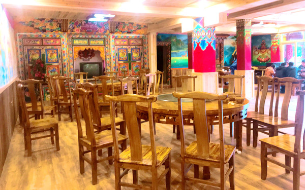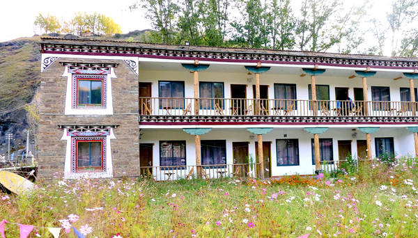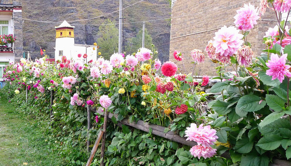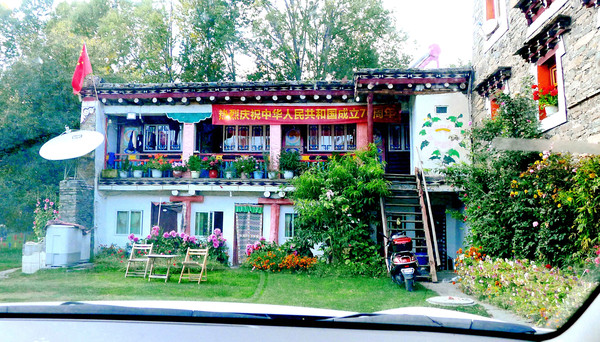 18:09入住“格桑花园客栈”,这是一座鲜花盛开的客栈,各色大丽花开得十分艳丽。客栈共有两处院落,我们被安排在“别院”,二层小楼,楼下就是停车场。客栈老板是重庆人,服务员是当地藏女。晚餐就在客栈餐厅解决,其中一道菜肴西红柿炒鸡蛋中的炒蛋特别好吃,有韧性,不知是用了什么搭配。