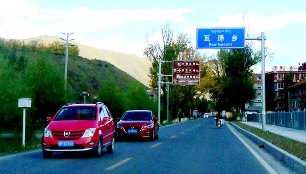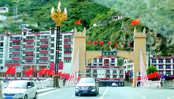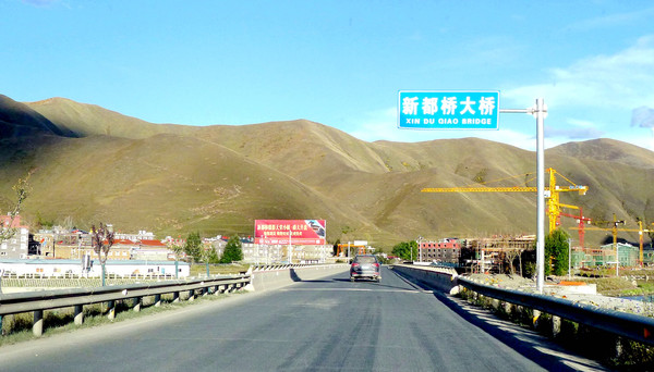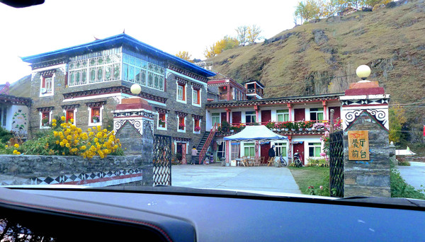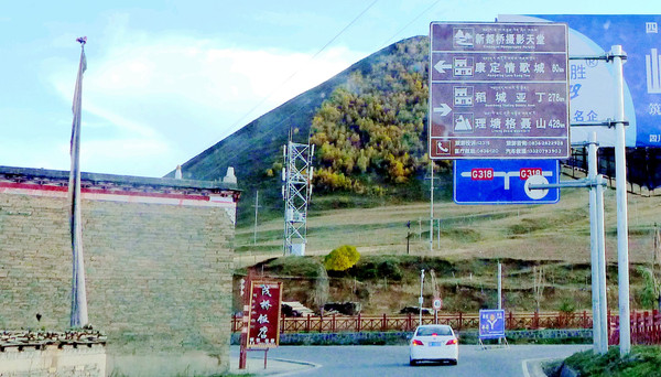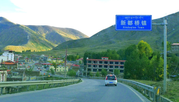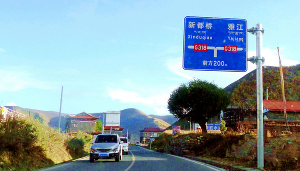 17:51驶抵国道G248与国道G318交汇的三岔路口,这里已属新都桥镇,X.J.预定了镇上的“格桑花园客栈”。导航指引我们进入G318后左拐,驶往新都桥、康定方向。然而,我们一路东行,驶过新都桥镇,驶过“新都桥大桥”,直至最终驶出新都桥镇辖区,进入瓦泽乡(康定市)境内,方才找到网上预定的格桑花园客栈。