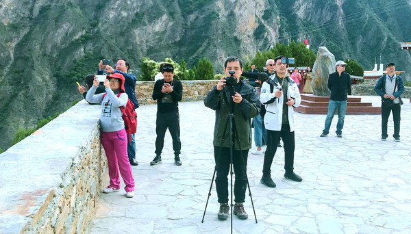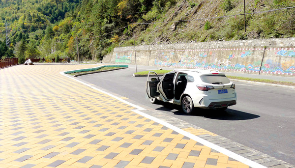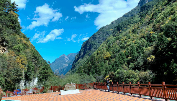 作为一条普通的国道,G350可谓是非常精致的公路,但因地处峡谷,总的感觉还是比较狭窄,并非所有路段都可方便停车,有关当局也是考虑到这一困境,现时正在公路沿线建造几处像模像样的观景台,12:03在一处已算是基本完工的观景台旁停车,这座观景台的面积颇大,建造也特别考究,甚至还有靠背长椅供人休息,感觉就好像是城市中的公园一般。