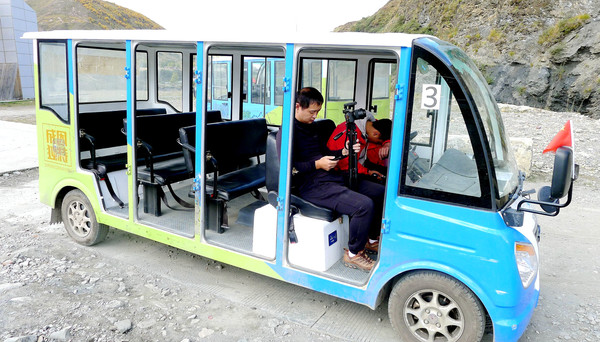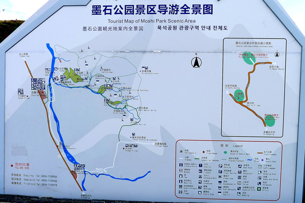14:19抵达“墨石公园”,此处是国家4A级旅游景区,距离八美镇约6公里。售票处门前也有广阔停车场,门票60元/人,观光车票20元/人,我们是购买一张门票,两张观光车票。因为游人不多,观光车须凑足人数方才发车,而且,总共也只行驶约5分钟,14:34把我们送到“中古村”下车,这里是景区木栈道的入口。司机指点大家进入景区后不要走回头路,切记要按照路标的指引,一直走到“地质博物馆”停车场,那里也有观光车,会把我们再次送回景区售票处停车场。