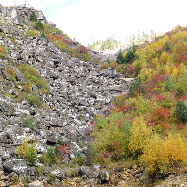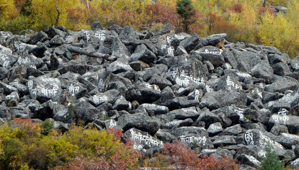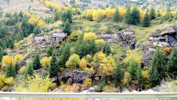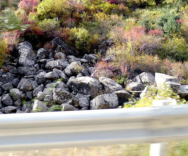 镇外仍为草原风光,但不久后即沿着一条溪流驶入山谷,公路两侧山坡上有很多因山岩崩塌产生的石块堆积,众多石块上都刻写了经文,16:55在一处刻经石块特别多的地方稍停、拍照。