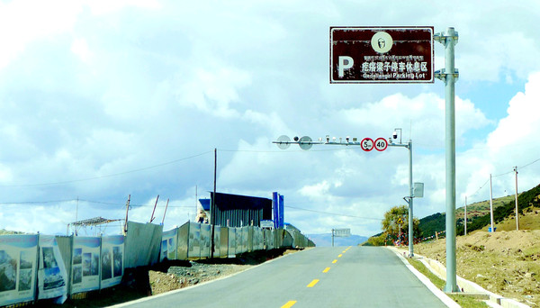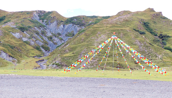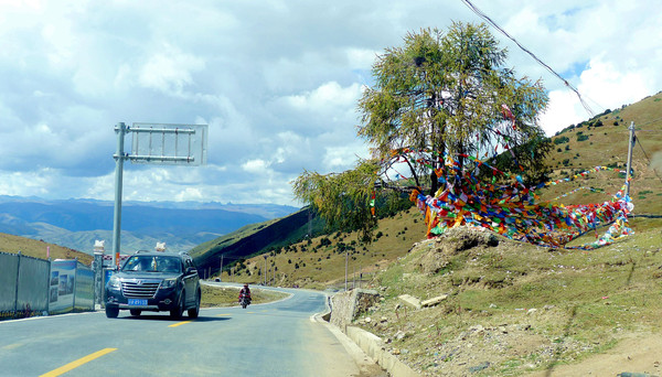 13:12离开“康巴之眼”,驱车西行约600米抵达“疙瘩梁子”垭口,它就是我们今天从丹巴到新都桥一路所要经历的最高点,海拔3918米。公路左侧正在施工建造“疙瘩梁子停车服务区”,右侧有株孤零零的的大树,五彩经幡缠绕树身,猜想应为当地藏民信奉的神树,它也是垭口周边的仅有的一颗树木。