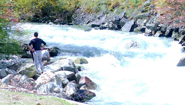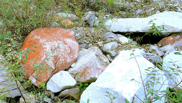 牦牛河道水流湍急,行车中时常可见陡石跌水,激流轰鸣,响声如雷。12:32看到有人在河畔戏水,我们也停车参与,询问得知他们竟然是来自厦门,跟我们一样也是搭乘飞机到成都,然后再租车自驾前来这里。荒山野岭能够巧遇老乡,大家都显格外兴奋。此处路边有少许“红石”,它们初看好似表面涂抹红色颜料,细看才知是有一层低等红色植物依附在石块表面,这种低等植物是“环保试金石”,稍有污染就难以存活,“红石”的存在表明此处环境极佳。