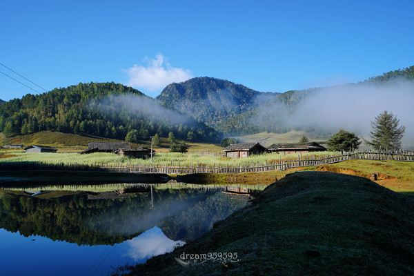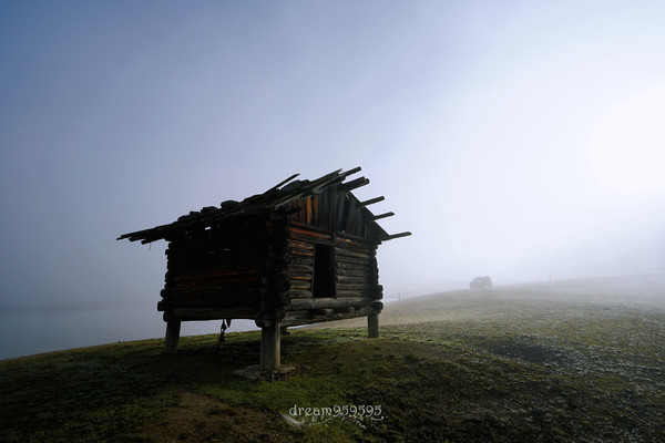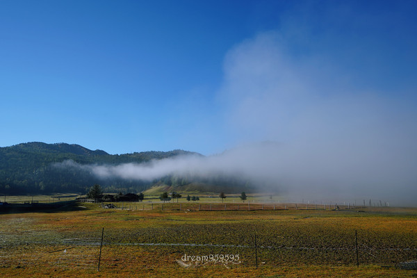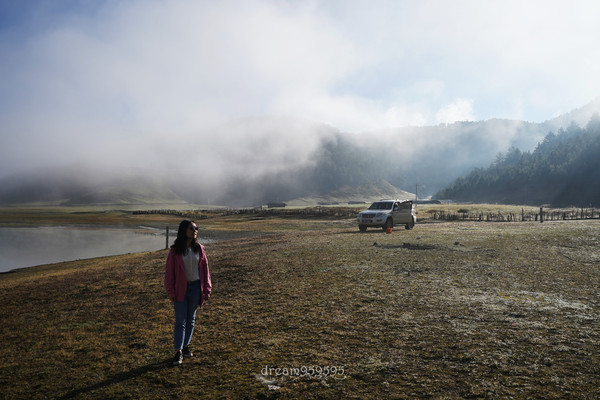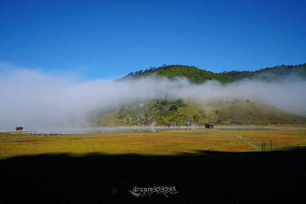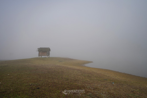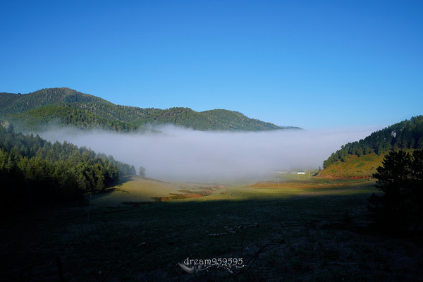 车行一个多小时的山路,从山谷外看是云海,到达海子被一片大雾笼罩。