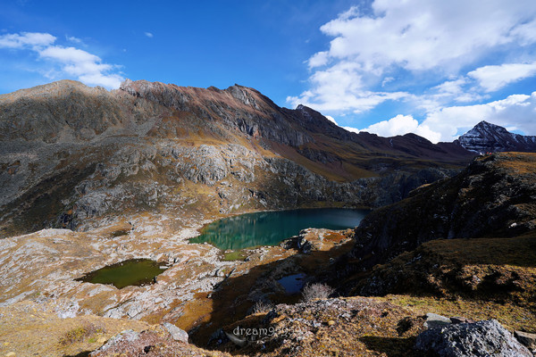一眼三个海子,颜色各不同,当中那个其实只能算水塘,因为用无人机看,其实远处还有一个海子,但是被山阻隔了,走路的话已经走不到了。