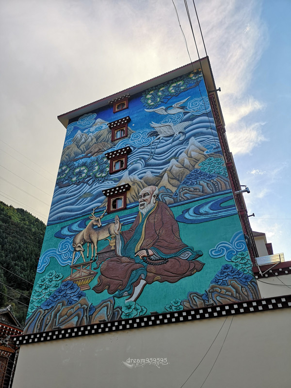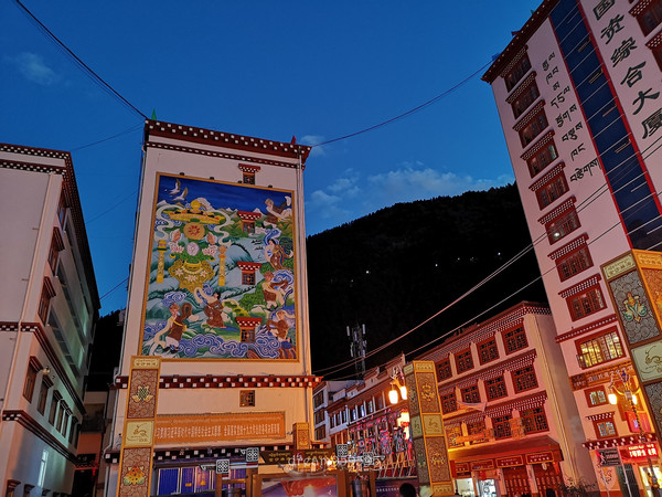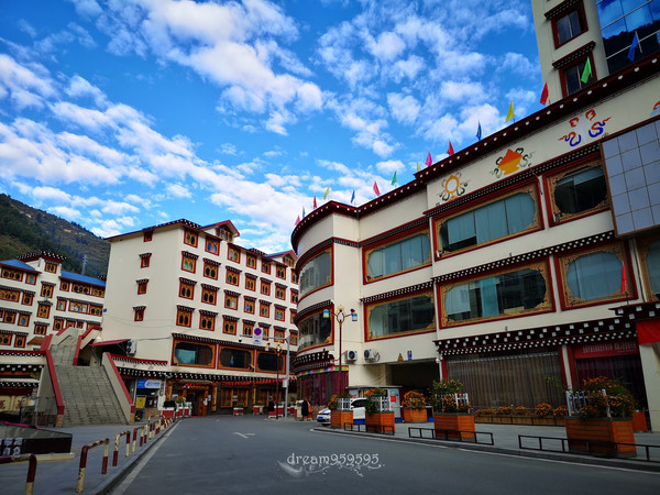 白玉县城建的真不错,建筑整齐划一,干净整洁,墙上还有壁画,远处可以看到山上的寺庙。