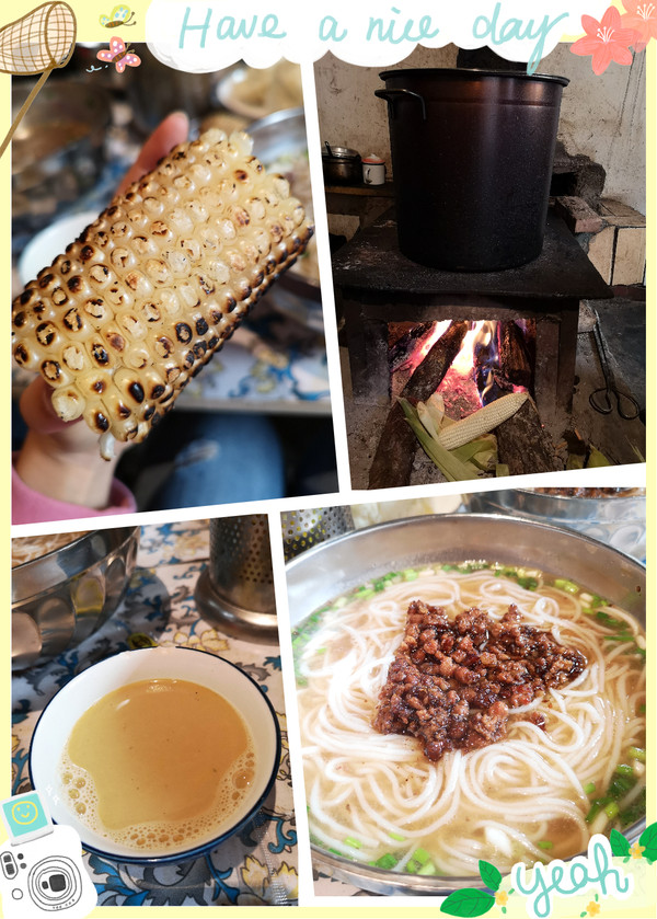 米粉加炸酱,味道还不错,尤其是骨汤,特别鲜。玉米剥开烤着吃,很香。