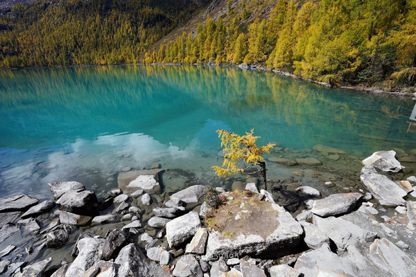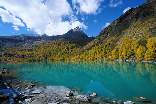 甲依拉措水色碧绿,秋色迷人,看着令人心旷神怡。