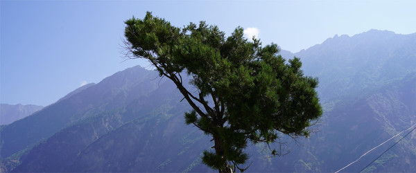 这里有一颗“迎客松”,郁郁葱葱,背景是一片青山。