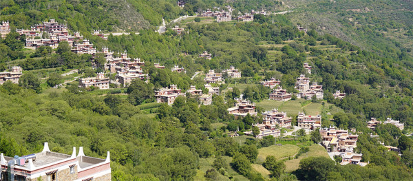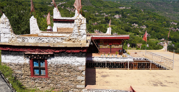 藏寨周围一片片树林,艳丽的藏寨和绿色的植被和谐的融合在一起。