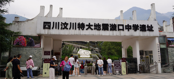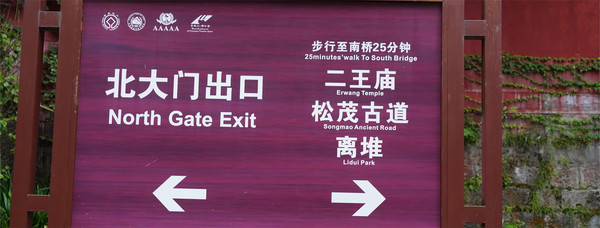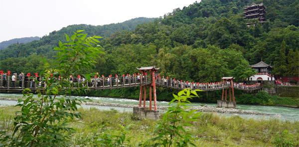 现在看到的是:桥东头设置了左右两个闸口,从右侧出口出桥是离开景区;不过,如果你想再次进入都江堰景区,可以回头从左侧闸口再次进入安澜桥,沿原路回到正门。