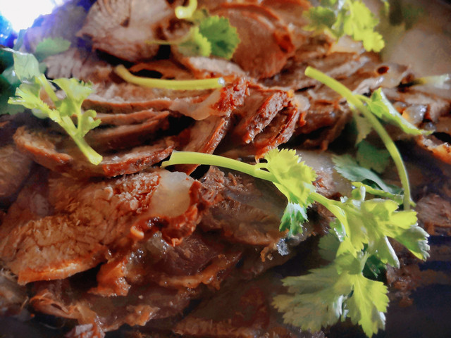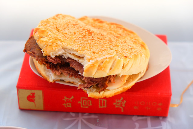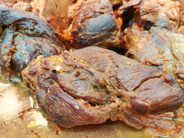 烧牛肉出锅后还有最关键的一步,需要用自制的香油烹炸2分钟,目的是让其外脆内嫩,吃起来别有一番风味。油炸的过程也颇考验功底,时间太长过焦,温度太高会糊掉,只有有经验的老师傅才能将火候掌握得刚刚好。吃的时候,当地人喜欢直接啃或者切片,另外还喜欢夹在烧饼里吃,酥脆的烧饼配着鲜嫩的牛肉,一下子可以干掉好几个。