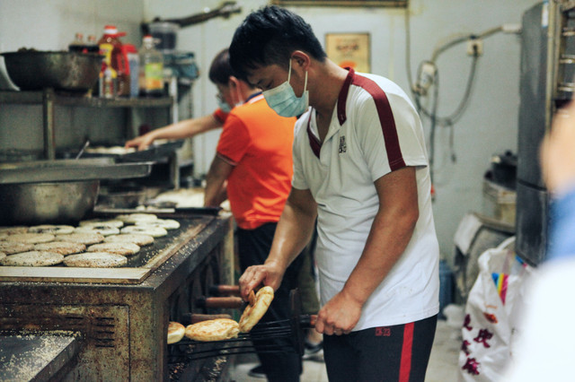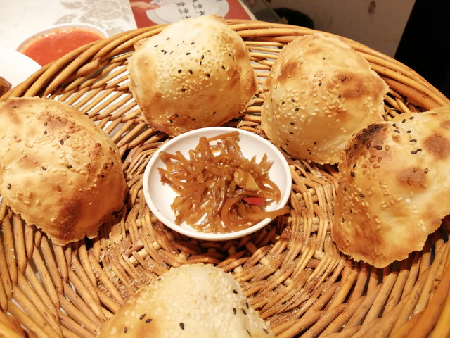 曹县烧饼用的小麦精粉,包入由香油、盐、花椒等调味的茴香等馅料,将沾满芝麻的面饼贴入高大的炉子里,几分钟后,外表焦黄,鼓鼓囊囊的烧饼就出炉了。光是闻着芝麻香味,就让人胃口大开。