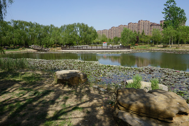 池塘漂睡莲、杨柳站岸边。