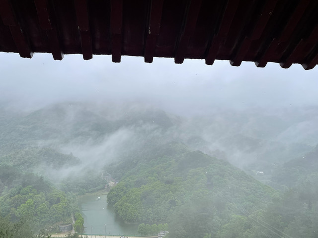 舟程20分钟到仙湖画廊景区,开始下雨。打伞登山直上揽胜亭。这介整个景区的最高点了,可看山,可看水。避雨,拍照。
