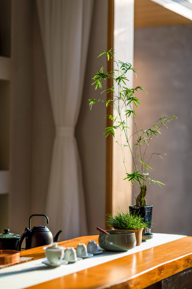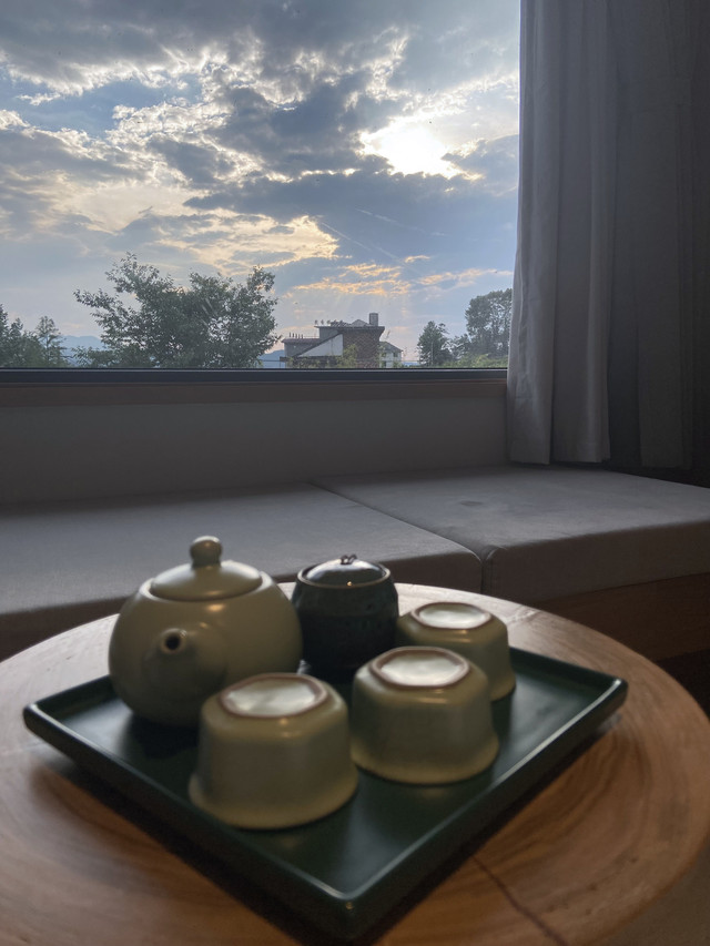 昨天爬了一天的山,今天醒来和朋友两人腿脚酸胀,仿若已废,也就没了去往别处的心思,但两个人大眼瞪小眼就有点无趣,索性和管家要了一壶茶,两人在中式茶室里学起泡茶品茗来。