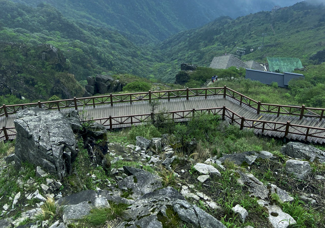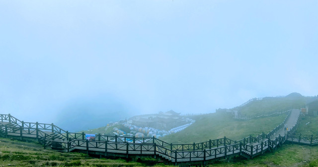 走完栈道就到达了金顶索道,我们乘索道上去,再步行一会儿就看到了武功山独特的高山草甸景观和千年祭坛。