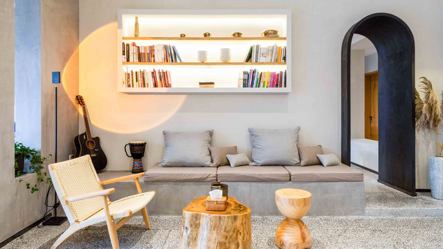 书吧里放置着吉他、各种摆设和书籍,营造出一个静谧的度假氛围。