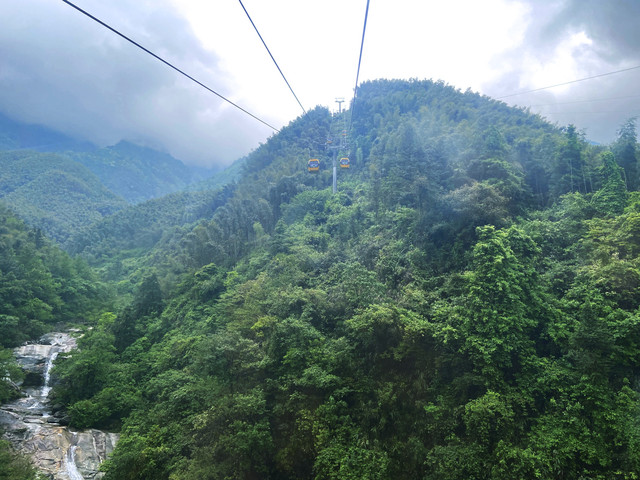经过石鼓寺、武功山文化园,又在景区服务中心买好票,坐上缆车,我们都兴奋不已,凌空观赏脚下的武功山,往上看是奇峰陡崖和原始次生林,往下看是青翠的竹林、梯田,景色怡人。