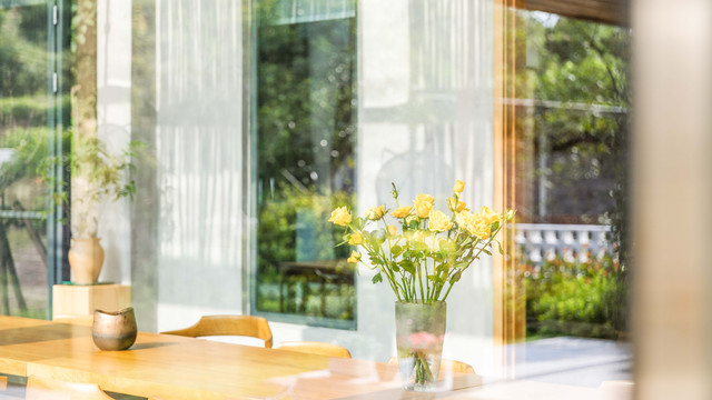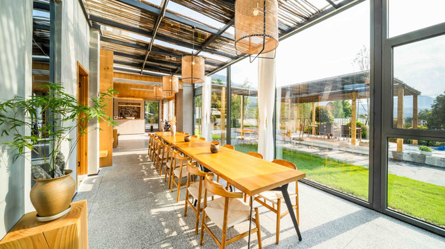 拥有透光玻璃的阳光活动室,自然光撒落在原木桌椅上,配上民宿精选的艺术画和插花,不用找角度,怎么拍都是美!