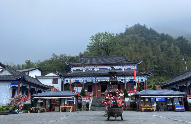从缆车出来,就到了福星谷区域,站在眺望台,极目远望都是群山竹海,整个人仿佛被山给包围住,连呼吸的空气都变得清新了。索道站旁边的紫极宫也被叫做“中庵”,里面供奉着武功山的王爷,我们在这里四处参观看了看。