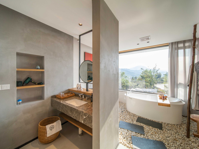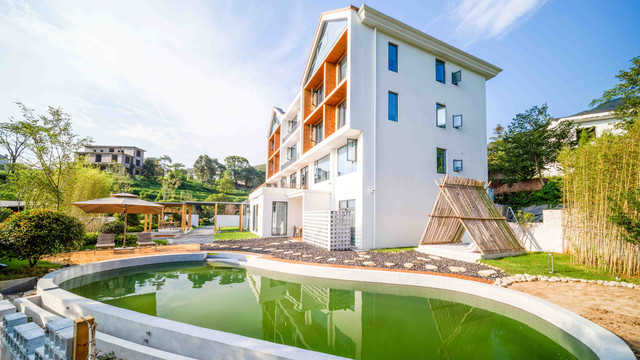 民宿共有20间客房,山涧围绕其间,既有坐拥青山画景的山景露台浴缸房,也有轻奢私密的亲子双床套房。