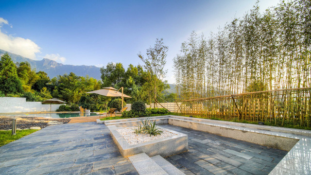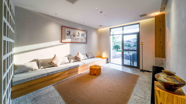 户外庭院的设计也颇有特色,沿着蜿蜒的石板漫步,有那么点禅意的味道,从心里就能感受极致的舒适与安宁,一些常见的自然木材、石子、竹子,设计成了民宿的廊下闲厅、枯山水小花园,说是一步一景都不过分,真是雅到极致了!