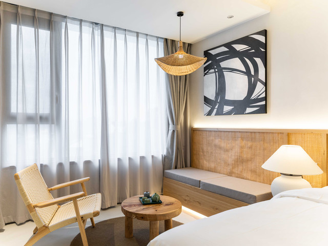房间内的用品很是考究,看得出来选品颇下功夫的,无论是一副抽象的艺术挂画还是一把绳编实木的椅子,以及实木墩茶几上的茶具,林林总总不难感受到民宿的用心,以及一分钱一分货的品质感。