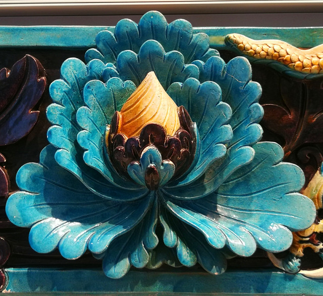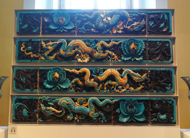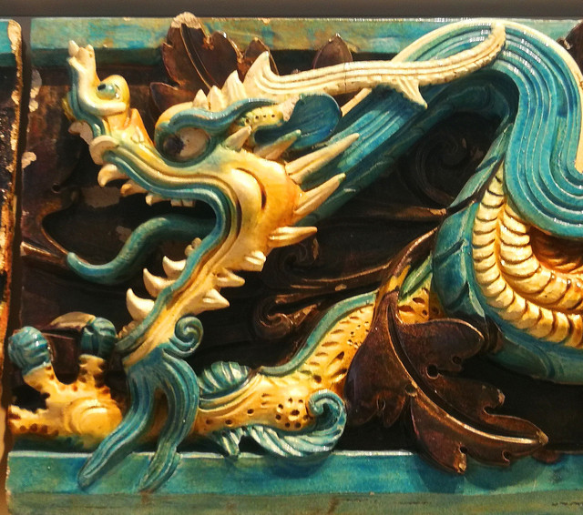 龙纹琉璃:来自中国山西省。年代大约在公元1465——1600年。这些琉璃曾是寺庙建筑屋脊上的装饰品。它们是一组琉璃制品的一部分。黄色的(阳)龙朝南放置在寺庙屋脊上,蓝色的(阴)龙则朝北放置。