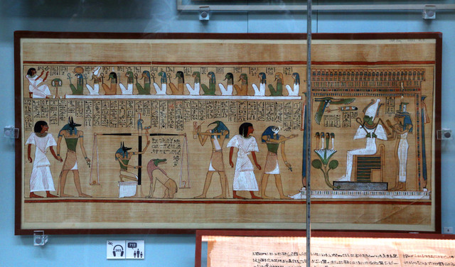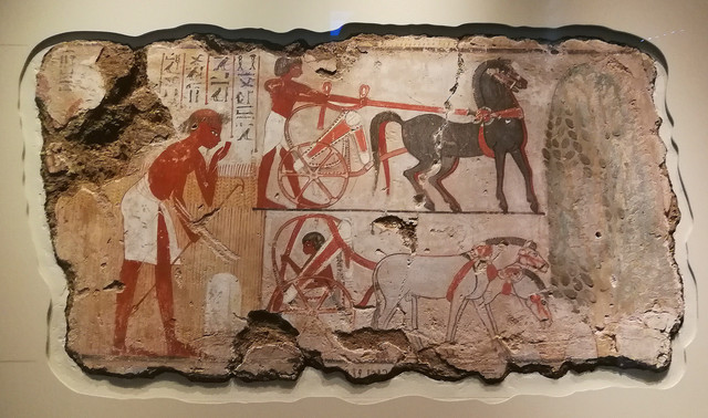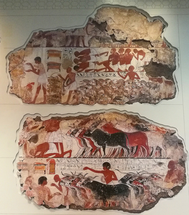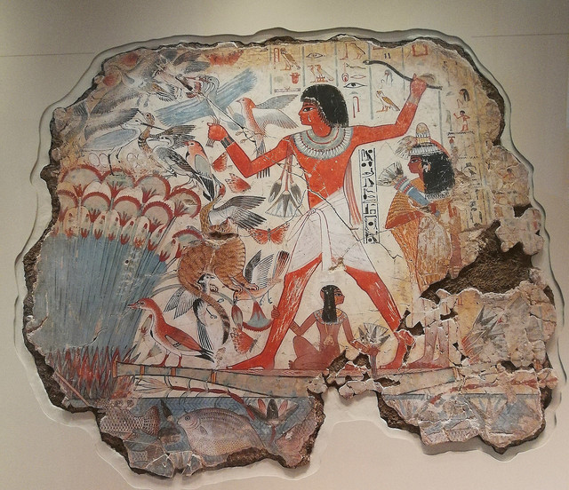 捕禽图:内巴蒙的墓室壁画。位于画面中心的人物就是陵墓的主人——内巴蒙。他生前曾在古埃及的重要城市底比斯担任高官。而壁画上的情景告诉我们,即使在死后,他也仍然可以继续拥有物产丰富、美丽悠闲的花园,仍然可以和妻子、儿女一起在长满莎纸草的河畔尽情打猎。内巴蒙站在船上,他的头和脖子是侧面的,因为头部从侧面图中最容易看清楚,可虽然是侧面的脸,但他的眼睛却又好像是正盯着观众,这是因为正面的眼比侧面的眼看上去更完整。
