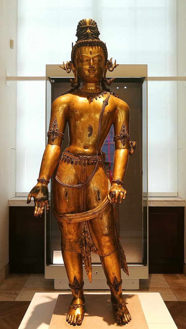 铜鎏金观音菩萨像:公元1400-1500年产于尼泊尔的观音菩萨像,收藏于1880年。