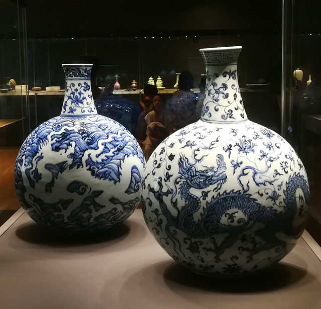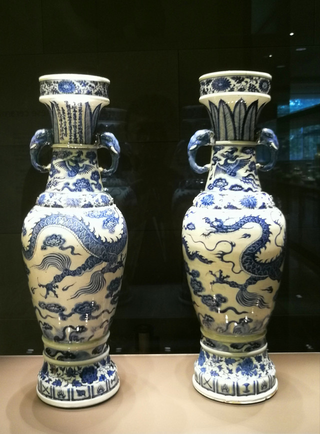 大肚花瓶:宣德年间,瓶上分别有蓝白两条龙,图案相似,阴阳对称。这对大肚花瓶来自中东地区的土耳其或伊朗,产地是中国江西景德镇市的珠山区。