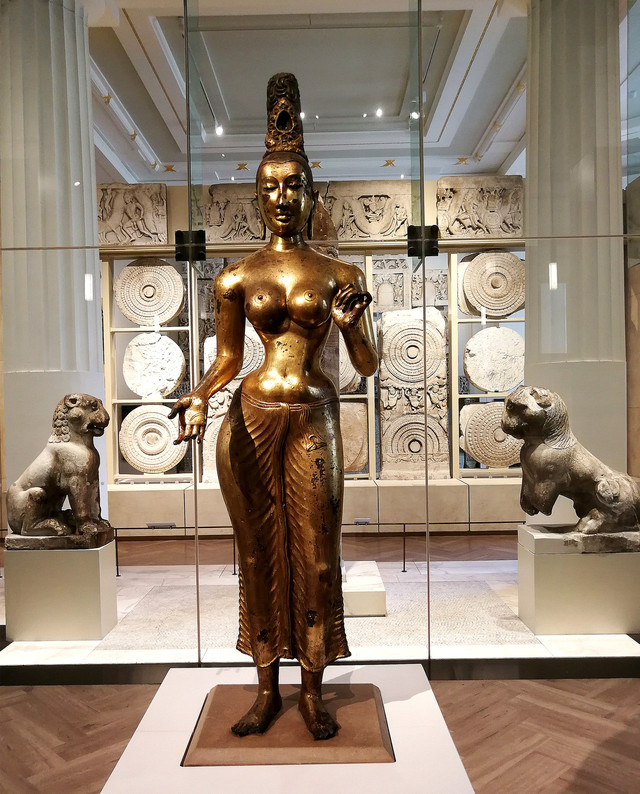 镀金青铜度母像:斯里兰卡。公元八世纪。度母是佛教中最伟大的女性佛,拥有众多的信徒。图中她伸出右手表示施舍和慈善。高1.45米。