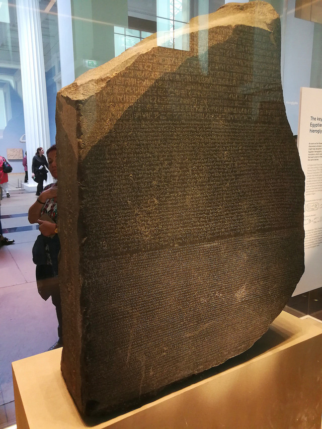 罗塞塔石碑:高1.14米,宽0.73米,是一块制作于公元前196年的大理石石碑,原本是一块刻有埃及国王托勒密五世(Ptolemy V)诏书的石碑。石碑上用希腊文字、古埃及文字和当时的通俗体文字刻了同样的内容。由于这块石碑刻有三种不同语言版本,使得近代的考古学家得以有机会对照各语言版本的内容后,解读出已经失传千余年的埃及象形文之意义与结构,成为研究古埃及历史的重要里程碑。罗塞塔石碑自1802年起保存于英国国家博物馆中并公开展示。