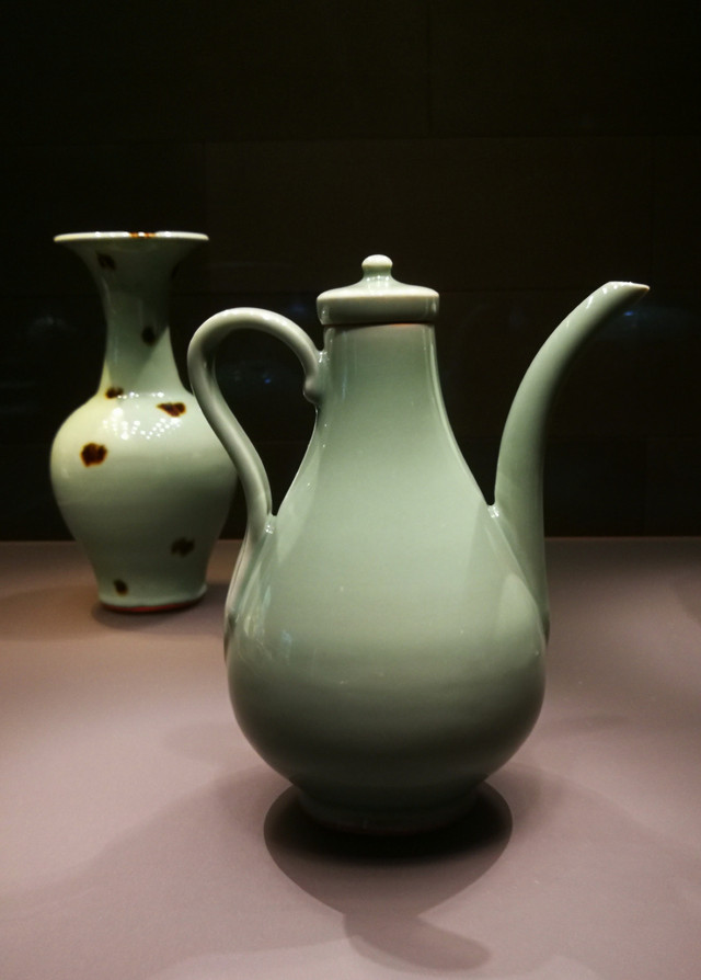龙泉青釉有盖执壶: 浙江省龙泉地区,高21.1厘米。宋代陶瓷执壶以长曲流、喇叭口、瓜棱腹为主要造型特征,首先是与宋代执壶的功能相关。宋代沿袭唐代饮茶之风,从宫廷到平常百姓,以相聚品茗为雅,宋代斗茶的盛行和点茶的流行,促使宋代瓷质茶具的大量生产。执壶作为饮茶具的重要工具占据了主要地位。