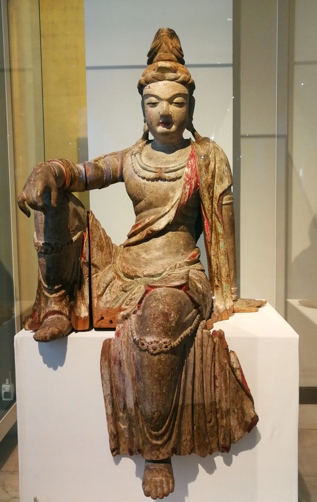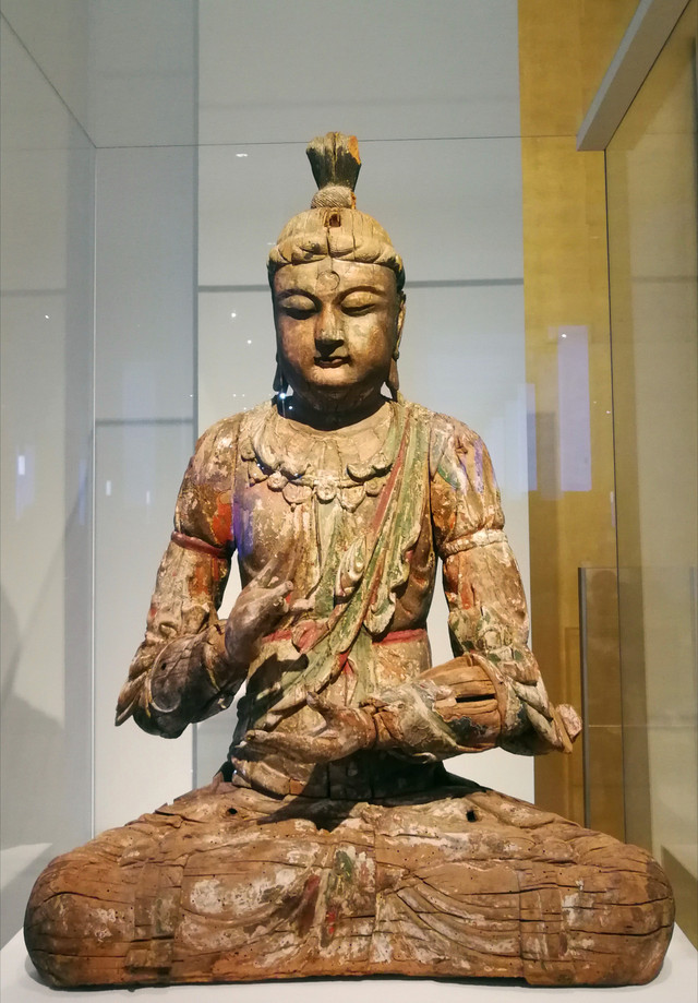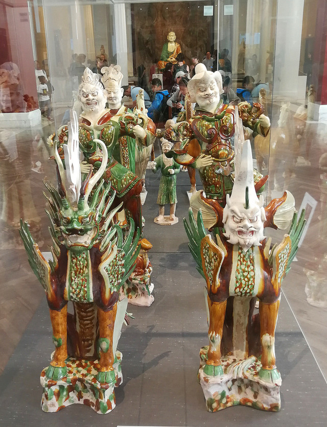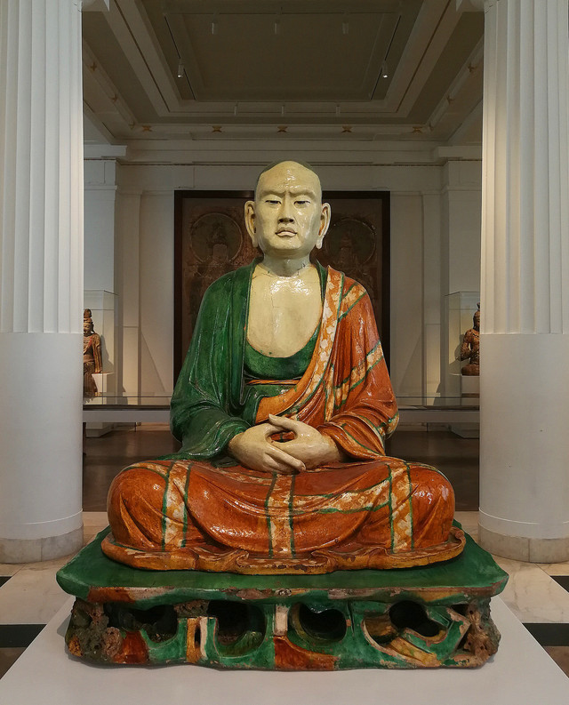 三彩罗汉像:这尊真人大小的塑像为陶胎上敷三彩釉,表现的是佛陀的弟子之一。他身穿袈裟,双手结禅定印,静坐在岩石形态的底座上。底座与罗汉像是可以分离的。至今为止,同类型的罗汉像,可查存世的共有十尊。其中九尊分別收藏在加拿大,美国,俄罗斯,法国以及英国的公共博物馆里,还有一尊收藏于日本的私人博物馆中。而俄罗斯所藏罗汉像的双臂已失,仅有头部和少量躯干部分保存了下来。这组罗汉像的特别之处在于其脸部, 手部以及皮肤的处理中所反映出的极为罕见的写实主义。他们仿佛如真人一般,表情平静祥和,巍巍然深具禅意。