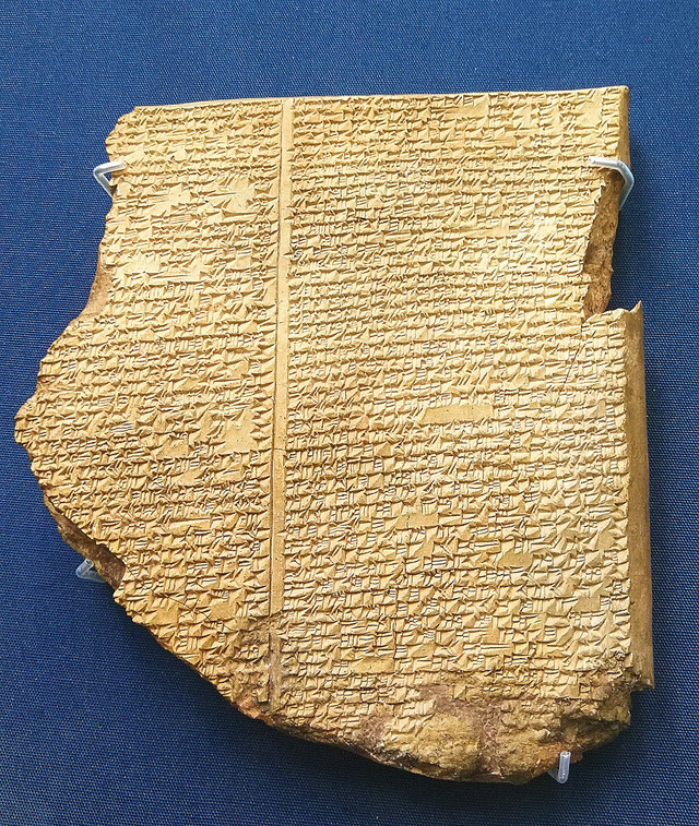 大洪水记录泥板:公元前700年-前600年,发现于伊拉克库云吉克(尼尼微)。这块契形文字泥板记录着世界文学史上第一部伟大史诗《吉尔伽美什史诗》的其中一章。神警告一男子,说大洪水即刻到来,要他造一条船以拯救他的家人和所有的活物。这个故事与《圣经》中诺亚方舟的故事及其相似,但年代更为久远。这段诗歌的释文于1872年公诸于世,引起轩然大波。