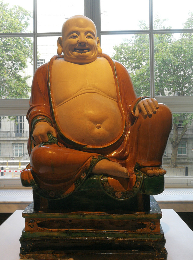 三彩弥勒坐像:明朝成化景德镇御窑厂的作品。三十年代,发现于中国河南省,被英国一个“艺术品公司”从当地一个农民手里“购买”,1937年,由中国运至大英博物馆过程中,最为珍贵的底座被损毁。说底座珍贵,是因为底座上带有明代神级大师“刘震”的名字。